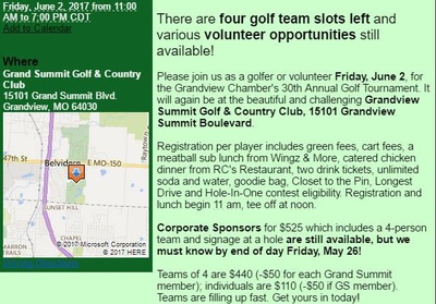 Join us and 120 other golfers for the Grandview Chamber’s 30th Annual Golf Tournament at the beautiful and challenging Grandview Summit Golf & Country Club, 15101 Grandview Summit Boulevard. Registration per player includes green fees, cart fees, a meatball sub lunch from Wingz & More, catered chicken dinner from RC’s Restaurant, two drink tickets, unlimited soda and water, goodie bag, Closet to the Pin, Longest Drive and Hole-In-One contest eligibility. Registration and lunch begin 11 am, tee off at noon.